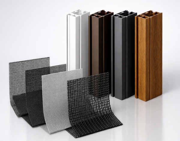 Помимо различий по структуре и назначению, полотна для москитных сеток производятся из разных материалов, каждый из которых имеет свои особенности. Самым распространённым материалом является стеклопластик, также известный как фибергласс. Он обладает высокой прочностью, устойчивостью к ультрафиолету и атмосферным воздействиям, не горит и имеет оптимальную стоимость. Именно из стеклопластика производится большинство стандартных сеток и многие специализированные варианты.